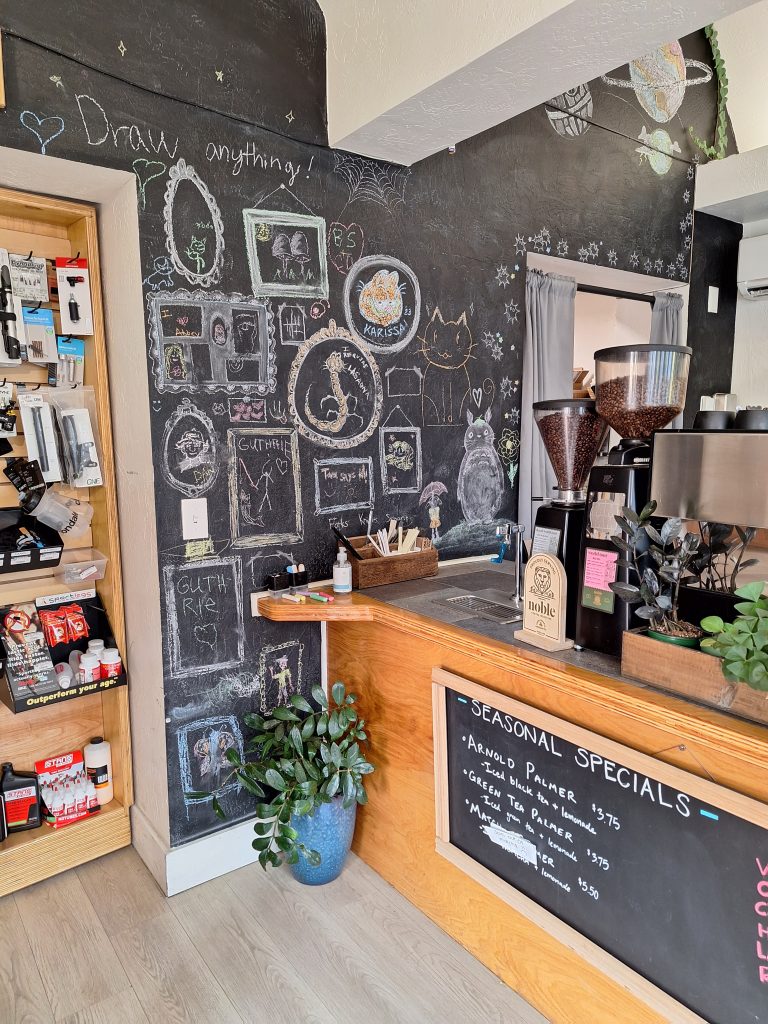 Walking through Lithia Park that morning, beneath the lingering haze from the California fires, I walked to the pond and realized– I needed coffee. Unlike my first visit to Ashland in 2016, I was simultaneously much more adventurous and a smidgen more lazy. I had only walked a block before I discovered the tiny Handlebar Bike and Coffee Shop with its scrumptious selection of sweeties, coffee, and a community art wall.